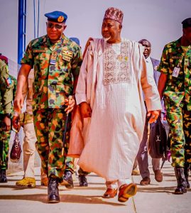 The Defence Minister continued his operational visit by also going to sokoto to inspect the combat readiness of the platforms and toured the new site where the permanent base of the newly established Air force component of military operations against banditry and terrorism and other facilities will be built at Sokoto Airport.